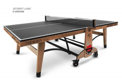 Теннисный стол X-DREAM от Start Line – воплощение элегантного дизайна, высоких игровых характеристик и инновационных технологий. Модель создана для требовательных игроков, ценящих стиль и надежность оборудования.nbsp;nbsp; Теннисный стол X-DREAM создан под брендом Start Line, который многие годы является символом качества и инноваций в мире оборудования для настольного тенниса.nbsp;nbsp;О принадлежности стола к имени ведущего российского производителя говорит не только первоклассное качество и высочайшие игровые характеристики стола, но и элегантный логотип, украсивший боковую поверхность основания и столешницы модели. Современный теннисный стол премиального уровня станет украшением любой игровой зоны. Модель X-DREAM с черной столешницей и основанием цвета темный ясень сочетает в себе стильный дизайн и функциональность. Столешница теннисного стола изготовлена из высокопрочного ЛДСП толщиной 22 мм, что обеспечивает идеальный отскок мяча и контроль над каждым ударом. Широкий деревянный кант 70 мм из ясеня повышает жесткость и надежность конструкции.nbsp;nbsp;Кромка из ПВХ 0,45 мм гарантируют высокую стабильность стола даже в условиях интенсивной эксплуатации. Отличительной особенностью модели является усиленная конструкция. Рама выполнена из комбинации высокопрочных древесины ясеня и стального профиля 50х25 мм с полимерным покрытием, что гарантирует высокую устойчивость и долговечность стола. Премиальная древесина ясеня в конструкции стола выполняет не только роль стабильного и долговечного материала, но и придает столу благородный внешний вид. Размер теннисного стола в рабочем состоянии: длина 274 см, ширина 152,5 см, высота 76 см, что соответствует стандарту ITTF. Совершенная система трансформации - уникальная разработка Start Line. Сложить и разложить модель без труда сможет один человек, а надежная фиксация положения гарантирует безопасность хранения и перемещения стола.nbsp;nbsp; Модель оборудована четырьмя регулируемыми опорами, которые позволяют выставить идеальный уровень игровой поверхности и обеспечивают стабильность положения стола. Четыре поворотных обрезиненных колеса диаметром 125 мм оснащены удобными стопорами, что позволит без труда переместить стол и зафиксировать его положение. Стол оснащен встроенной сеткой и двумя съемными держателями для хранения теннисных аксессуаров. Конструкция стола предусматривает одиночный режим игры, что делает его универсальным для различных сценариев тренировок. Теннисный стол X-DREAM – высокое качество и инновационный дизайн. Идеальный выбор для домашней игровой зоны, клуба или спортивного зала.nbsp;nbsp;Откройте премиальный уровень оборудования и наслаждайтесь каждым мгновением во время игры с X-DREAM!